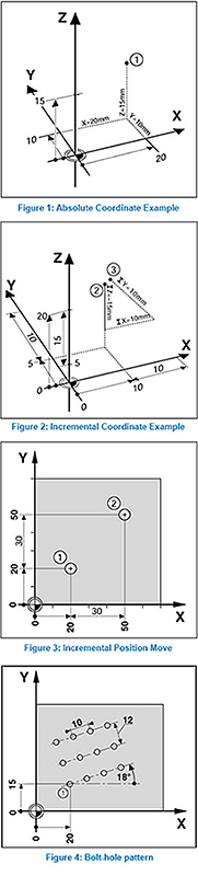 Incremental coordinate positioning is very useful tool when the operator doesn’t want to do addition or subtraction to figure out the absolute coordinates. Figure 3 shows how the operator can put in XI = 30 and YI = 30 instead of doing the addition to find out what the absolute coordinate of position 2 is when moving from position 1.
