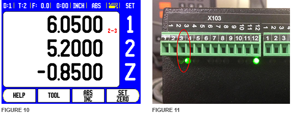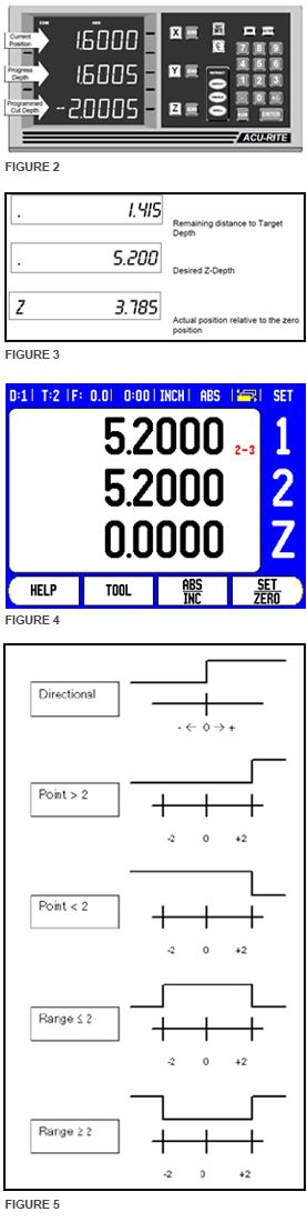 The ranges on the CSS I/O module represent the switching outputs which are programmed on the 200S or 300S. The ACU-RITE and ANILAM DROs used a maximum of three relays. The old EDM DROs displayed three values on the screen: desired Z-depth, remaining distance to the target depth, and the actual position relative to the zero position. With the 200S and 300S, the user gets to decide which axis on the display that he/she wants to display each piece of information. The desired Z depth will be set on the 200S or 300S using a datum. The user would enter information for the desired Z-depth on one of the axes that doesn’t have an encoder plugged into it, and the axis that does have an encoder plugged into it will be the axis that tracks the actual position. The remaining axis will need to be setup in the display configuration settings of the 200S or 300S to subtract the actual position of the Z-axis from the desired Z-axis depth. (See figures 2, 3 and 4.)