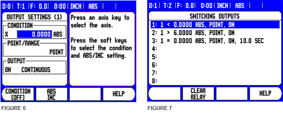 Once the display has been setup, the next thing to consider is the switching outputs. The programming of the switching outputs will depend on the configuration of the old DRO versus the 200S or 300S. The switching outputs option is only shown when the DRO recognizes the CSS I/O module is plugged into the 200S or 300S. The user has the option of five separate conditions to choose from to accommodate a variety of conditions. The five conditions are: point greater than, point less than, range less than or equal to, range greater than or equal to, and directional (see figure 5). Each condition is entered in the menu shown in figure 6.