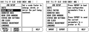 Next, the user needs to go to the Job Setup menu. At the bottom of the Job Setup menu, the user will find “Import/Export” soft key option. The user should press this option and the soft key options will change. The user will find the soft key option “Export”, and by pressing this option, the configuration data will be exported to the PC (see Figures 6 and 7).