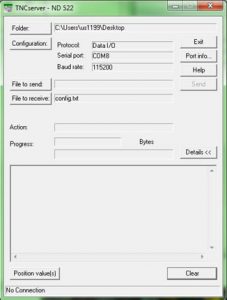 Next, open HyperTerminal or TNCserver on your PC and setup the COM port settings to match the DRO settings. The default COM port settings for the VUE is 115200, 8, None and 1. To access the Configuration menu, the user clicks on the Configuration button shown in the picture below. Since this demonstration is using the VUE DRO, the settings for the TNC server are shown in Figures 3 and 4.